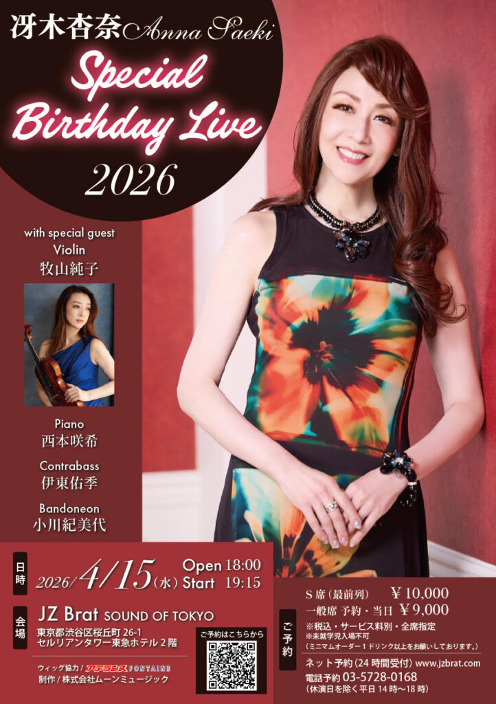 冴木杏奈バースデーライブ2026開催!! スペシャルゲストにバイオリニストの牧山純子、バンドネオン奏者に小川紀美代、ベーシスト伊東佑季、ピアニスト西本咲希を迎えてお贈りする特別なひとときを一緒にお祝いしましょう!!