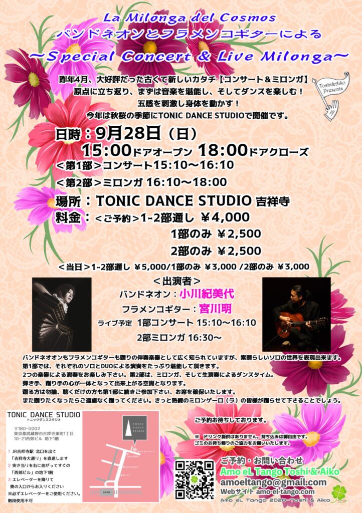 9/28(日)吉祥寺TONIC DANCE STUDIOにて、バンドネオンとフラメンコギターによる秋桜の〜Special Concert & Live Milonga〜に出演します。