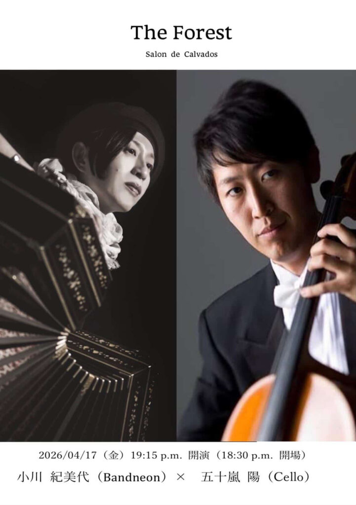 バンドネオンソロ、そして地元在住のチェリスト・五十嵐陽さんとのジョイントをじっくりお楽しみください!席数が限られていますのでご希望の方はご予約をお勧めします。