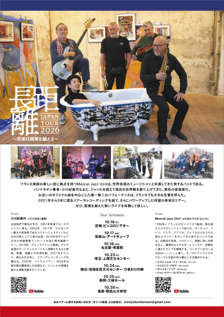 世界を旅するバンドネオン奏者・小川紀美代とMezcal Jazz Unit、フランス公演を経ての待望の再来日ツアー!